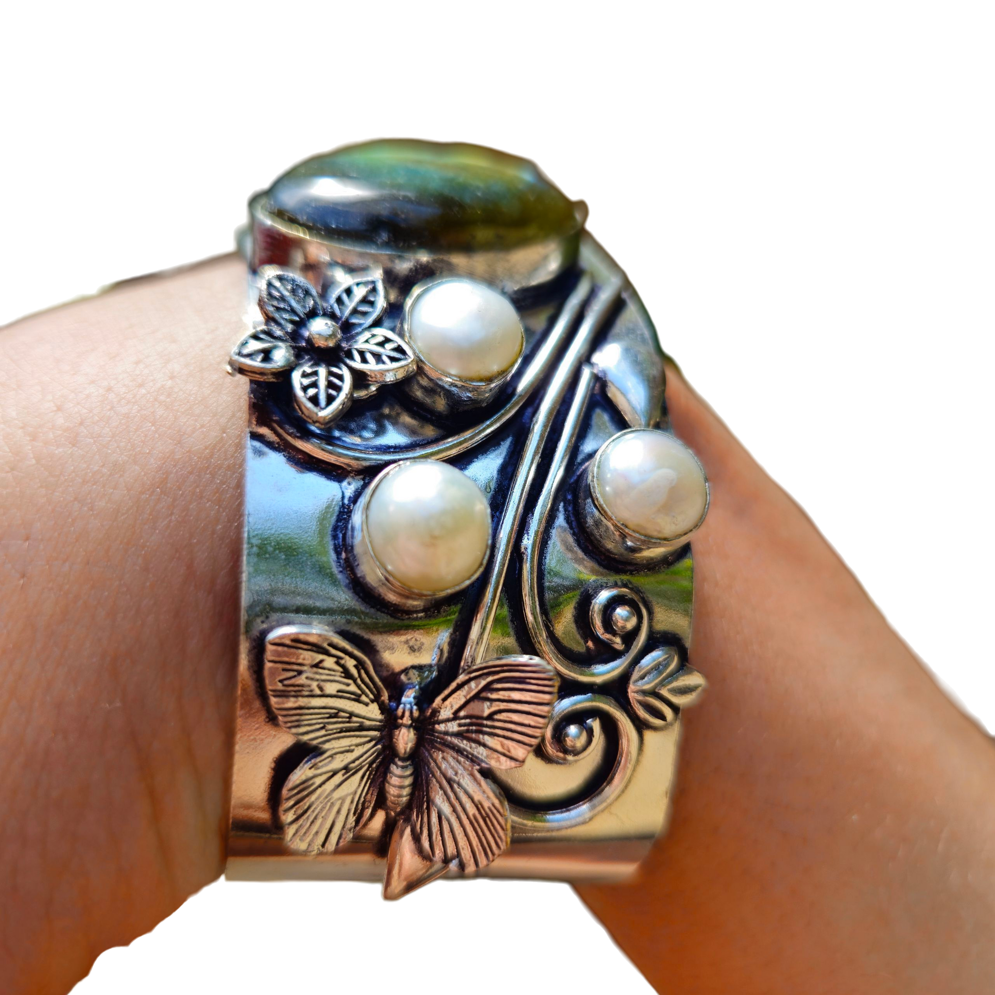 This Labradorite & Pearl Butterfly Cuff Bracelet encased in .925 silver is an enchanting statement piece that blends gemstones with intricate artisan detail. Featuring a luminous oval labradorite paired with glowing freshwater pearls, the wide silver-toned cuff is accented with floral and butterfly motifs that add an elegant, nature-inspired touch. Bold yet refined, this bracelet embodies organic beauty and craftsmanship, making it a standout accessory for any jewelry collection.