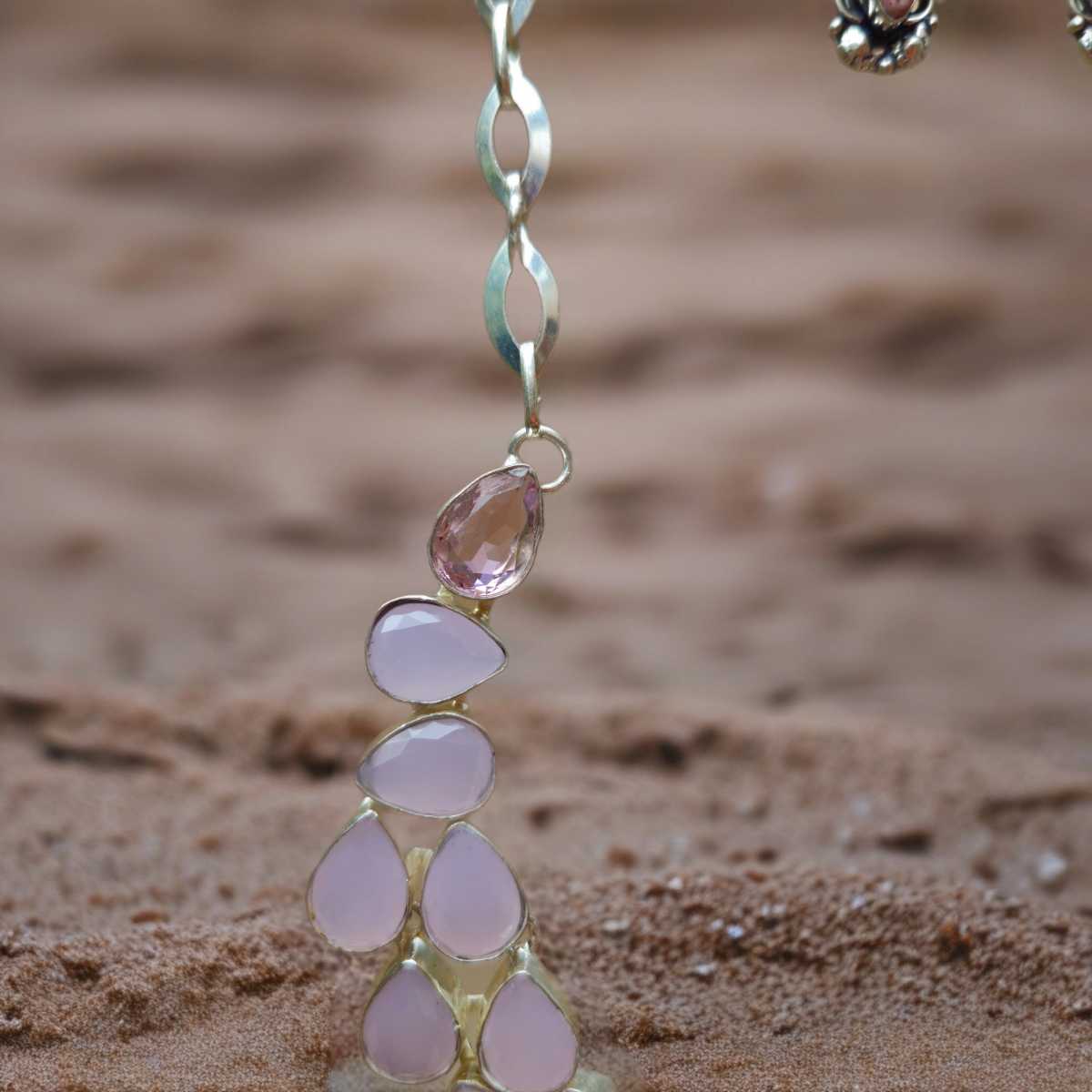Bring a little bit of nature’s magic into your jewelry collection with this handcrafted set. Featuring a bold agate slice pendant framed in .925 silver tones, complemented by soft pink teardrop accents and paired with matching gemstone earrings. This one-of-a-kind piece captures the beauty of the ocean and sky—perfect for beach days, special occasions, or when you just want to stand out.