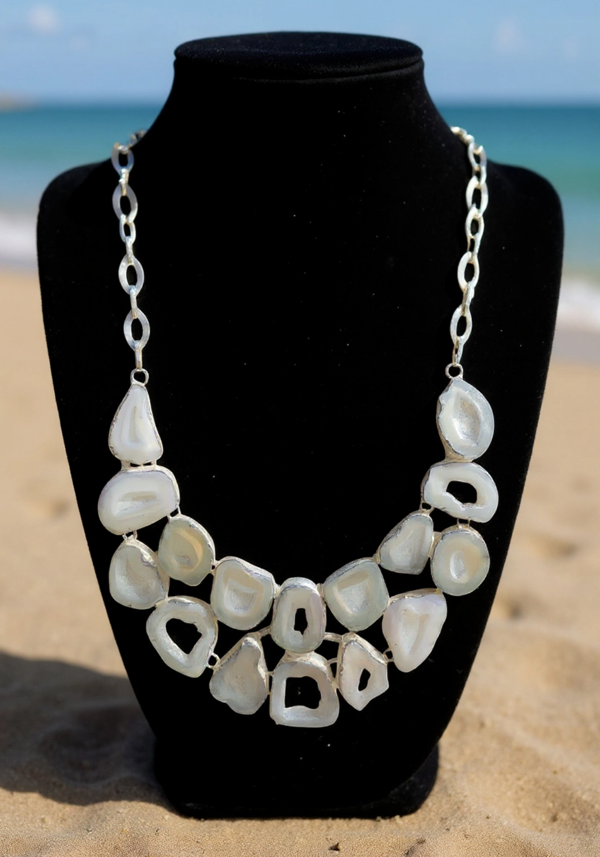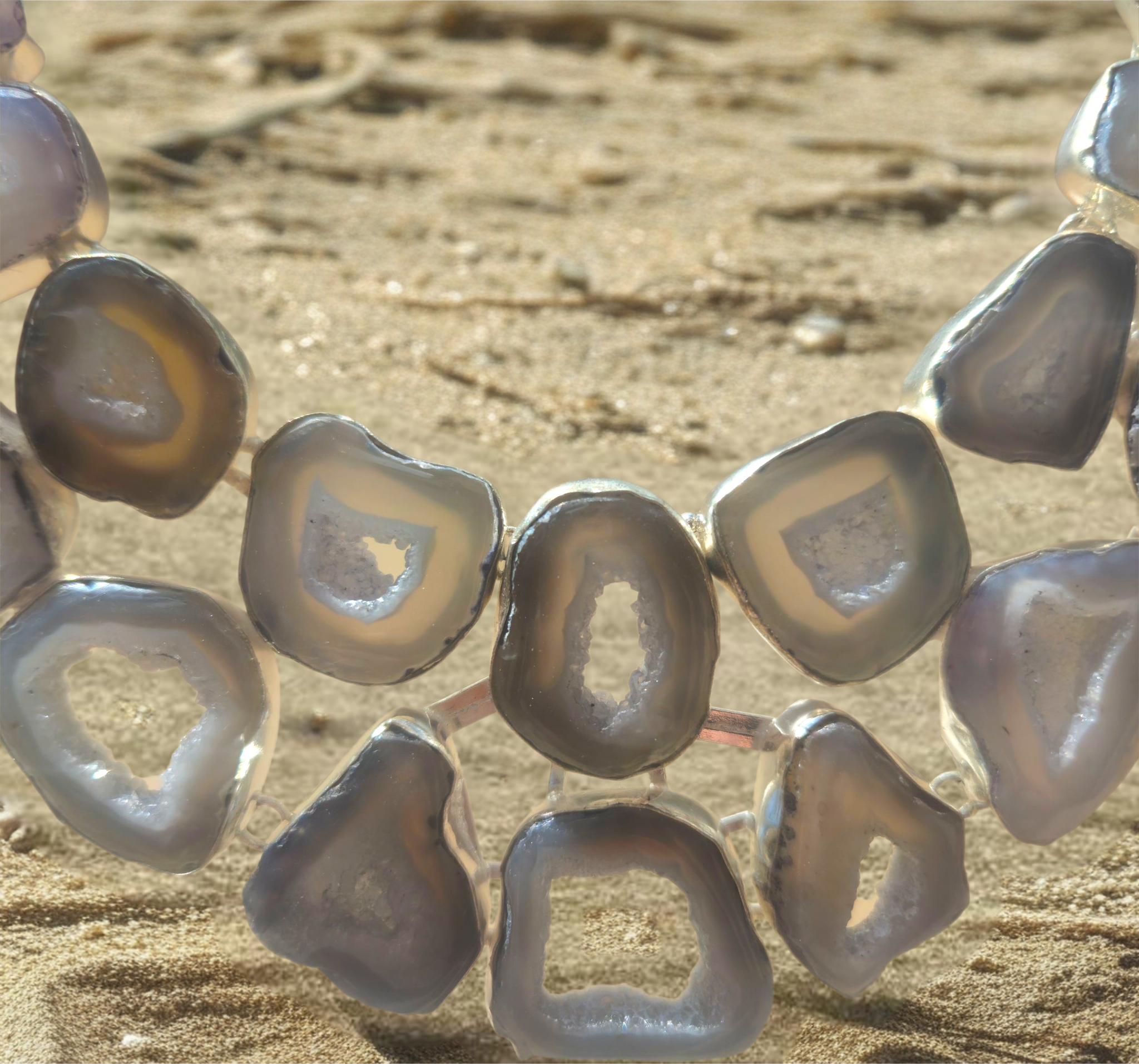 This Agate Geode Slice Statement Necklace with various shades of grey captures the raw beauty of natural gemstones in a bold design. Featuring polished agate slices in soft and smoky grey tones, each piece reveals unique crystal formations and hollow geode centers. Linked together on a .925 silver encased chain, the stones create a striking, organic pattern that makes every necklace completely one-of-a-kind. Elegant yet earthy, it’s the perfect accessory for adding natural sophistication to both casual and formal looks. *Note: These two photos are the exact same necklace. The closeup shot is intended to show the color more clearly.